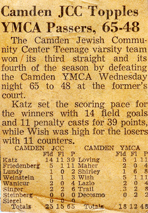 Remembering Katz brought thoughts of how cool he was on the court and how he played his stealth like game. He was usually the best player on his teams. After reading the stats and seeing that Katz had scored 39 points for the Jewish Community Center against us and I wondered at that time who is Katz. He wouldn't go away as he returned with another team, St. Joe's and continued to excel. At that time Katz was the tallest player on the court at about 6'2" or 6'3". He had a stealth like game scoring many of his points on offensive rebounds. He was one of the few competitors that I got to know in a friendly way via conversation. As we matured and moved on to the high school level, I asked him why he didn't play for Camden High and his quick reply was he wasn't good enough.