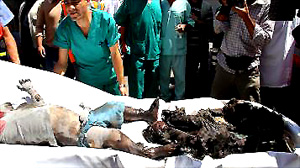 This gruesome photo appears to show the charred remains of a Palestinian civilian as a result of Israel's bombing of Gaza. As a reward for a job well done RT News reported that the Israeli government gave their military a 10% raise - Al Jazeera photo