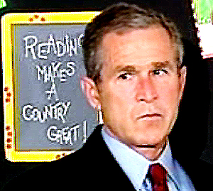 Then President George W. Bush had a reputation of not being on the job. As depicted in the documentary Fahrenheit 9-11 Bush is seen here visiting a school for a book reading while the World Trade Center was being struck down with US passenger planes commandeered by terrorist from Saudi Arabia. He is being informed by one of his aids. - Fahrenheit 9-11 screen shot