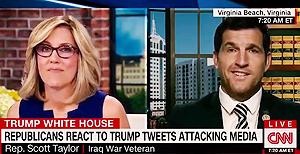 US Congressman (Virginia) Scott Taylor, an Iraq war veteran and former Navy Seal, was guest on CNN was asked his opinion about the CNN Trump logo bashing video. He replied that he wasn't concerned about it, leaving the CNN host miffed -- (Screenshot @ https://www.youtube.com/watch?v=iivjJaLsjaY)