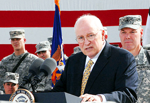 Vice President Dick Cheney speaks to a crowd of service members on Balad Air Base, Iraq, March 18, 2008. Cheney was in the area visiting with service members deployed in support of Operation Iraqi Freedom. - (U.S. Air Force- photo by Senior Airman Julianne Showalter) (www.army.mil)