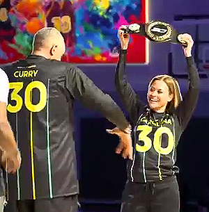Sep & Seth Curry’s mom Sonya celebrates with her husband Dell her victory in a shooting contest where she made a one handed underhand HALF COURT SHOT! - (Screen Shot)