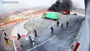 Ten Illegal Israeli settler thugs flee after setting fire to two trucks of Palestinian businesses' in the occupied West Bank (Palestine). - (screen shot of The Listening Post program)