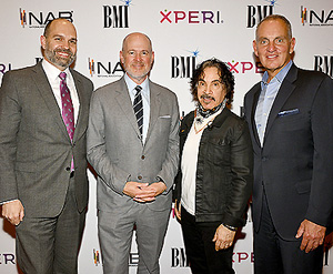L to R: NAB's President & CEO Curtis LeGeyt; NFL Network's Rich Eisen accepts Television Hall of Fame Award for the NFL; BMI songwriter and Radio Hall of Fame inductee John Oates and BMI's President & CEO Mike O'Neill at the BMI/NAB 75th Anniversary Dinner held at Encore Las Vegas on April 8, 2025. - (Photo Credit: Lester Cohen for BMI)