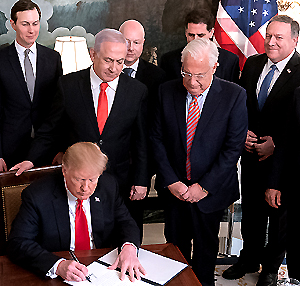 Trump's Zionist gang including from left Jared Kushner, the Trumpster, Israel Prime Minister Benjamin Netanyahu, US Ambassador to Israel David Friedman and far right Pillsbury Dough Boy and honorary Zionist Mike Pomepo formally recognizing Israel’s sovereignty over the Golan Heights - (Shealah Craighead - photo)