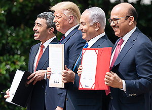President Donald J. Trump, Minister of Foreign Affairs of Bahrain Dr. Abdullatif bin Rashid Al-Zayani, Israeli Prime Minister Benjamin Netanyahu and Minister of Foreign Affairs for the United Arab Emirates Abdullah bin Zayed Al Nahyanisigns sign the Abraham Accords Tuesday, Sept. 15, 2020, on the South Lawn of the White House - (Official White House Photo by Joyce N. Boghosian)
