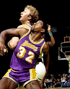 Los Angeles Lakers Magic Johnson and Boston Celtics Larry Bird in Game two of the 1985 NBA Finals at Boston Garden Date 30 May 1985 - Steve Lipofsky www.Basketballphoto.com