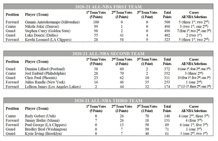The All-NBA Team was selected by a global panel of 100 sportswriters and broadcasters. Players were awarded five points for each vote to the All-NBA First Team, three points for each vote to the Second Team and one point for each vote to the Third Team. Voters selected two guards, two forwards and one center for each team, choosing players at the position they play regularly. Players who received votes at multiple positions were slotted at the position where they received the most votes.