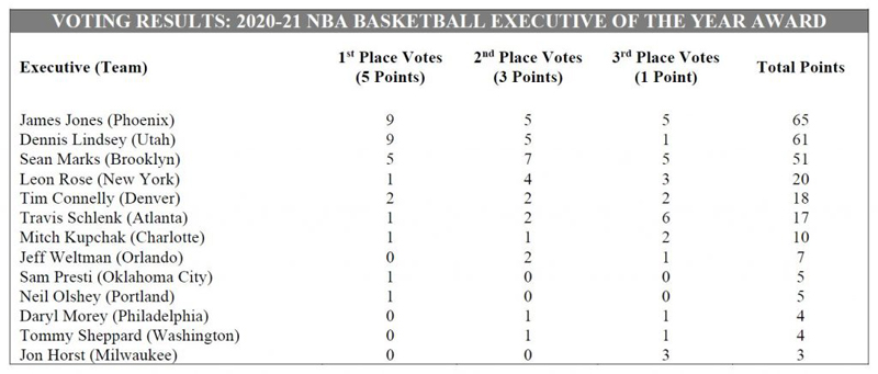 Jones received nine of the 30 first-place votes and earned 65 total points from the voting panel, which comprised one basketball executive from each team. Utah Jazz Executive Vice President of Basketball Operations Dennis Lindsey finished in second place with 61 points (nine first-place votes). Brooklyn Nets General Manager Sean Marks finished in third place with 51 points (five first-place votes). Executives were awarded five points for each first-place vote, three points for each second-place vote and one point for each third-place vote.