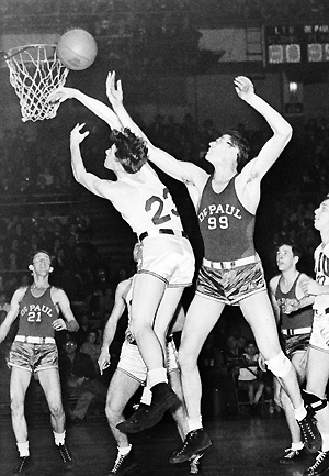George Mikan (99) then of DePaul University during a basketball game at Madison Square Garden, New York in 1944 prior to signing with the then Minneapolis Lakers. Mikan became the first super star of the NBA - (New York World-Telegram and the Sun Newspaper Photo)