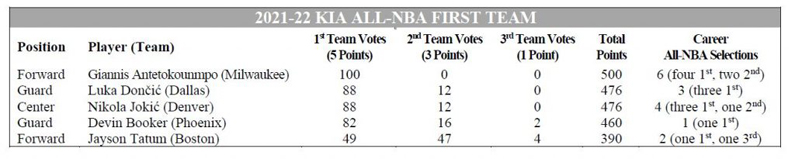 Antetokounmpo was the only player to receive All-NBA First Team votes on all 100 ballots (500 total points), earning his fourth consecutive selection to the First Team and sixth All-NBA Team honor overall (First Team, Second Team and Third Team). This is the third All-NBA First Team selection each for Doncic (476 points) and Jokic (476 points), the NBA Most Valuable Player. Booker (460 points) is making his debut on the All-NBA Team. Tatum (390 points) joins Booker as a first-time selection to the All-NBA First Team.