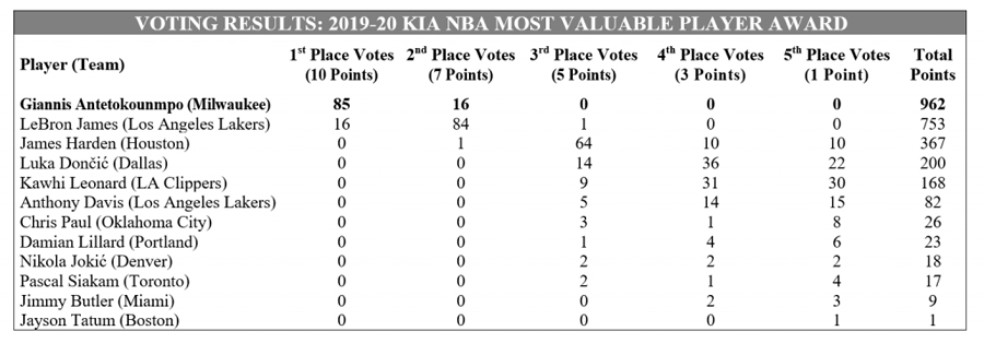 Antetokounmpo received 85 of 101 first-place votes and earned 962 total points from a global panel of 100 sportswriters and broadcasters as well as the NBA Most Valuable Player Award fan vote. Los Angeles Lakers forward LeBron James received the other 16 first-place votes and finished in second place with 753 points. Houston Rockets guard James Harden (367 points) finished in third place, followed by Dallas Mavericks guard Luka Doncic (200 points) in fourth place and LA Clippers forward Kawhi Leonard (168 points) in fifth place.