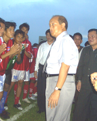 Cambodian Prince Norodom Ranariddh Sihanouk talks to Cambodian national team after match with German club side - NR photo