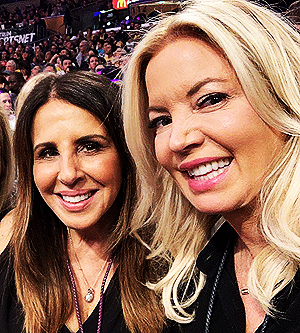 Best buds Los Angeles Lakers primary owner Jeanie Buss (right) and Linda Rambis(left) two of the Lakers franchise 4 prong BRAIN TRUST that has created a disaster - (screen shot)