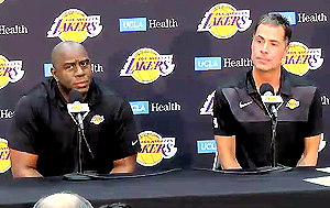 Magic Johnson and Rob Pelinka had a strange relationship as Lakers executives. Johnson eventually departed the franchise without first informing owner Jeanie Buss as he took a secret hike out the back door - (screen shot)