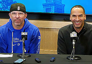 A pensive looking Dallas Mavericks coach Jason Kidd listens while the smiling Mavs GM Nico Harrison explains to the media why he traded Luka Doncic to the LA Lakers without consulting Kidd - (Screen shot photo)