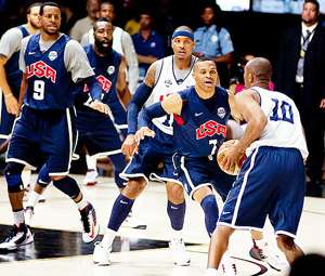It's show and tell time to see if the US basketball team (seen here in practice) can back up Kobe Bryant (#10) and LeBron James boast that the 2012 US Olympic team can beat the 1992 US Dream team. France with who have six NBA players on their roster will be their first test - Tim Shelby from Arlington, VA, USA photo