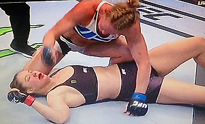 DOWN & OUT - Holly Holm gives a bloody Rhonda Rousey her final pounding and shocks the world in taking Rousey's UFC title - (Screen shot - UFC)