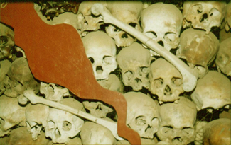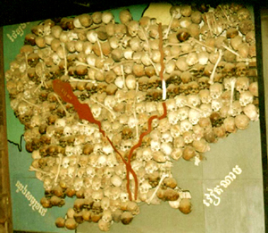 The maps 300 skulls and bones represented the grim results of an estimated 1.7 million people who were tortured and murdered in Po Pots Khmer Rouge Killing Fields from 1975-79.