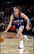 No… the Dynamic Duo is not Batman & Robin; it's John Stockton & Karl Malone of the Utah Jazz…and ONLY the Utah Jazz. When you consider that five is the magic number of years in some professional leagues for professional athletes to qualify for a pension that embellishes the productivity of Stockton & Malone who have been teammates for 16 seasons. They have helped produce 16 consecutive winning seasons for the Jazz, the second longest such streak in NBA history. Their egos blend together. In contrast to the Lakers Shaquille O'Neal and Kobe Bryant who have been teammates only five years. Watching the Laker duo's relationship is like walking on hot coals hoping your feet don't burn or on eggshells and hoping the shells don't crack. With Malone & Stockton it's a smooth business partnership…they are in harmony. There is no argument over who has the ball and who takes the shots. Stockton became 39 March 26th, 2001 and is the elder of the two. The Jazz selected the 6-1 (18,5) guard in the first round as the 16th overall pick of the 1984 NBA draft. The club selected Malone a 2-9/259lb (2,06/117,5) forward who will be 38 July 24th, in the first round the following year as the 13th overall pick. With those selections the Jazz laid the foundation of long time NBA respectability. At the ages of 38 & 39 you could consider these two older than dirt by NBA standards. The bottom line they are producing with the same potency as they did when they were in there twenties. The Jazz have reached the playoffs every year that the duo have been members of the team. Prior to their arrival the Jazz were virtual league cellar dwellers and qualified for the playoffs only one other season without Stockton or Malone in franchise history. They made it to the NBA finals twice losing to the Chicago Bulls on both occasions in 1997 & 1998. The Jazz reached the Western Conference finals three other times 1992, 1994 & 1996. Prior to this season the Jazz finished first in their division six times. The teams 64-18 record in 1996-97 was their best ever. By being so productive throughout their careers Stockton & Malone each hold a number of franchise and NBA records. Now playing his 17th NBA season, Stockton holds the NBA record for most games played in a career with 1258 through the end of last season. Malone is 37 [38 on July 24] playing his 16th NBA year is the leagues all time leader in free throws made. Stockton is the leagues all-time assists and steals leader. Through the end of last season he totaled 13,790 assists. He finished sixth in the league last season with 8.6 (apg). He was one of only four players to dish out over 700 assists with 703. That trailed only Gary Payton's 732, Sam Cassell 729 and Nick VanExel 714. Through 68 games this season he added 712 to his overall total giving him 14,502. That's over 4,300 more than Magic Johnson who is second on the NBA's all-time list with 10,141. The Washington state native's best single game performance was against the San Antonio Spurs when he registered 28 on January 15, 1991. TRIVIA QUESTION: Who is the NBA's all-time assists leader for a single game? As the NBA's all-time steals leader Stockton had 2,844 through last season. He added 115 through 68 games this year. He was ranked No. 1 in assists per 48 minutes played this campaign through 68 game s with 14.6. He also led the NBA in 3 point shooting with 53-108 (.491%). Both are members of the 50th anniversary all-time NBA team that was selected in 1996. The dynamic duo do not have pedigree big time college backgrounds. Stockton attended Gonzaga University when hardly anyone knew about the school nor where it was. Malone attended Louisiana Tech, which has never been considered a basketball powerhouse. In 1984 when Stockton graduated from Gonzaga the school had never achieved the NCAA Tournament status and recognition that it has earned these past few seasons with their success in the event. Malone was a pillar of strength for his Louisiana Tech team averaging 18.9 point per game, and had 889 rebounds during the three seasons he played with the team. When you consider his NBA lifetime scoring average is 26 ppg you can see his game has improved. He is one is one of only three NBA players to have scored 30,000 points with 31,041 through last season trailing Kareem Abdul-Jabbar 38,387 and Wilt Chamberlain 31,419. He has added 1550 through 68 games this year. His 61 against Milwaukee January 27, 1990 is his all time best. His 41 against Philadelphia Dec 20, 2000 is his seasons best. He also holds the NBA record for most seasons with 2,000 or more points. Though they haven't won an NBA championship ring together they have achieved a championship that many NBA champs haven't. Both were members of the Original Olympic Dream Team that won the Gold medal in 1992. They repeated winning the gold as members of Dream Team 2 in 1996.