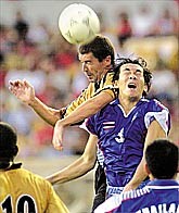 Man U's Roy Keane takes a header and gives Thailand's Tawan Sripan a headache