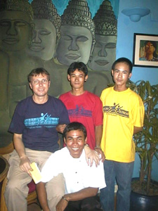 Pictured top left to right Gustav Auer, Sopheak (student), Sopheap (student), kneeling Mr. Bora (manager/teacher). In the background is a painting of Bayon faces by student Kohrung - NR photo