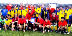Khemera seen here with players from the Netherlands are defending Cambodian Premiere Football League champions - NR photo